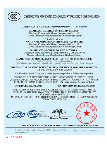 故城縣九和制動(dòng)元件有限公司主導(dǎo)產(chǎn)品為:汽車剎車片、裝載機(jī)剎車片。剎車片采用高溫高壓的熱壓工藝、設(shè)備、生產(chǎn)線、能保證質(zhì)量穩(wěn)定,有為主機(jī)廠配套生產(chǎn)的經(jīng)驗(yàn)和能力。劉如根商標(biāo)是公司主要商標(biāo),公司還有飛人標(biāo)牌、蛟龍牌、橫空出世等品牌!公司有多個(gè)剎車片檢驗(yàn)設(shè)備,剎車片摩擦性能定速摩擦試驗(yàn)機(jī)與國家非金屬礦制品檢驗(yàn)中心試驗(yàn)機(jī)是同公司生產(chǎn)的同型號(hào)試驗(yàn)機(jī)。拖曳試驗(yàn)機(jī)2020年通過中國建材檢驗(yàn)集團(tuán)咸陽有限公司檢驗(yàn)合格,剪切試驗(yàn)機(jī);布氏和洛氏試驗(yàn)機(jī)。2021年公司通過國家強(qiáng)制性CCC認(rèn)證、通過過19001-2000idt ISO 9001:2015質(zhì)量體系認(rèn)證,IATF16949認(rèn)證,歐盟Emark認(rèn)證。剎車片執(zhí)行GB/T11834-2011、GB 5763-2018標(biāo)準(zhǔn)。公司產(chǎn)品先后曾給山東臨工、徐工、卡特彼勒(山工)、徐州美馳車橋公司、肥城金城橋公司,山東路通橋箱科技公司,山東博士樂公司,郯城郯液公司,日照金···